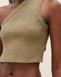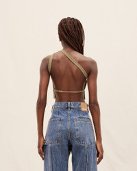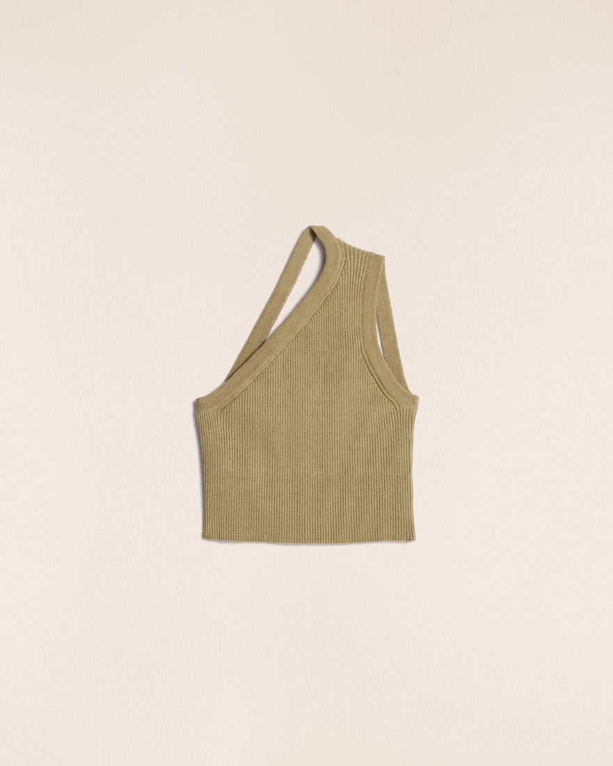 Le Raphia Asymmetric crop top - Short, fitted and asymmetrical shape - Rib knit - Single shoulder strap - Halter top with adjustable straps 86% Linen - 13% Polyamide/Nylon - 1% Elastane Made in Portugal Ref.213KN009-2330-530