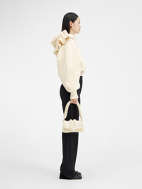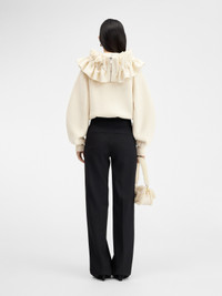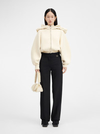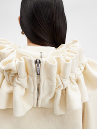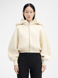 LE CHOUCHOU Scrunchy hood sweatshirt - Cropped, round fit - Rib knit - Long raglan sleeves - Scrunchy-shaped hood with ruffles and zipper - Zipper sweatshirt - Ribbed cuffs and hem The model is 175 cm and wears a size 36. 53% Virgin wool - 44% Cotton - 3% Polyamide Made in Italy Ref.233KN325-2321-110