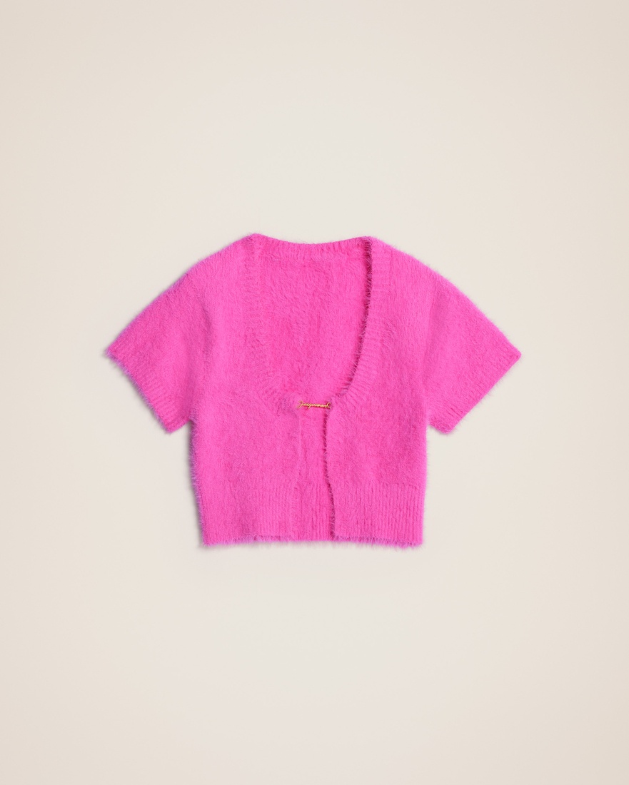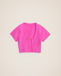 LE SPLASH Short sleeved charm logo cardigan - Fitted shape with short sleeves - Fluffy mohair knit - Round plunging neckline - Sewn gold metal charm logo The model is 176 cm and wears a size 34 97% Polyamide/Nylon - 3% Elastane Made in Portugal Ref.213KN209-2380-430