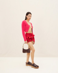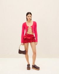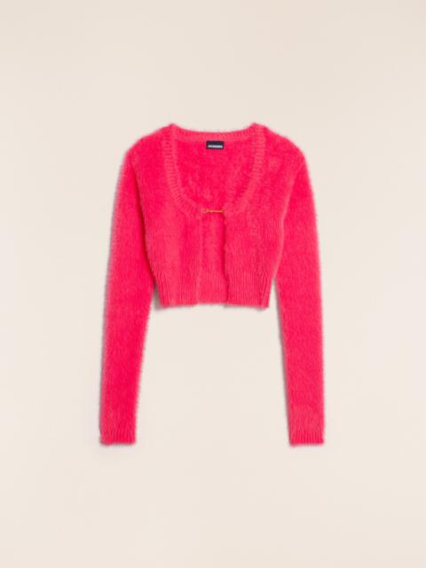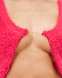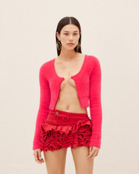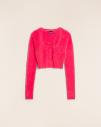 Le Raphia Fluffy charm logo long sleeve cardigan - Fitted shape with long sleeves - Fluffy mohair knit - Round plunging neckline - Sewn gold metal charm log 98% Polyamide/Nylon - 2% Elastane Made in Italy Ref.223KN010-2380-450