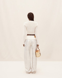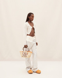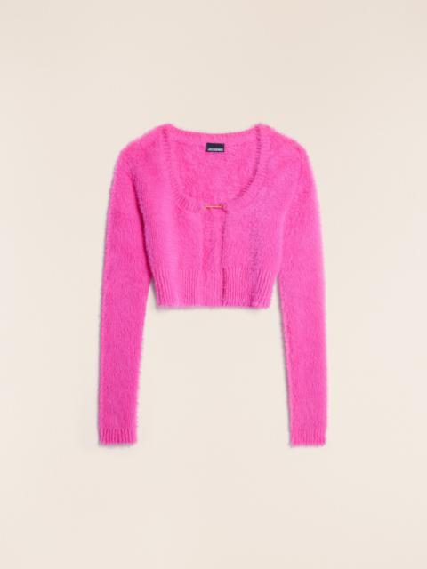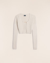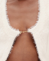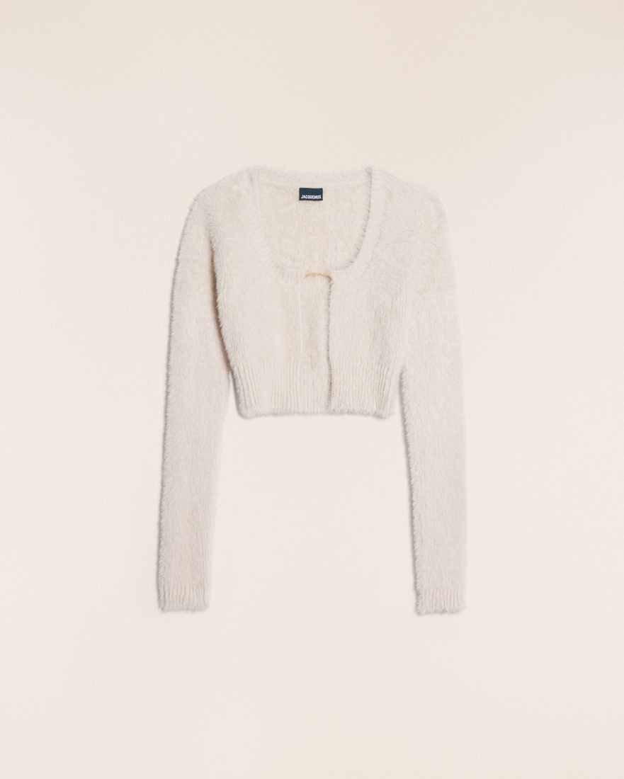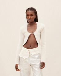 LE PAPIER Fluffy charm logo long sleeve cardigan - Fitted shape with long sleeves - Fluffy mohair knit - Round plunging neckline - Sewn gold metal charm logo 98% Polyamide/Nylon - 2% Elastane Made in Italy Ref.223KN010-2380-110