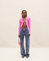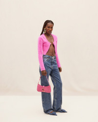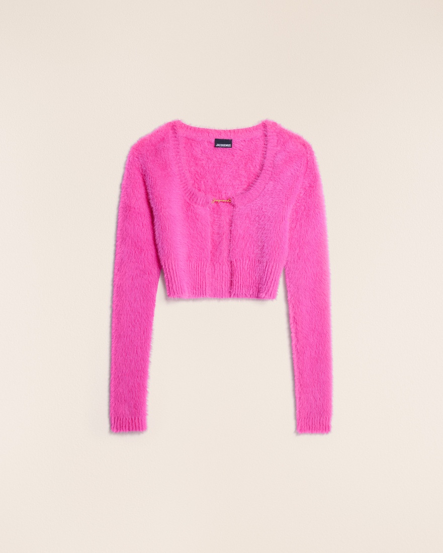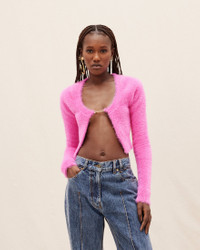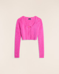 LE PAPIER Fluffy charm logo long sleeve cardigan - Fitted shape with long sleeves - Fluffy mohair knit - Round plunging neckline - Sewn gold metal charm logo 98% Polyamide/Nylon - 2% Elastane Made in Italy Ref.223KN010-2380-430