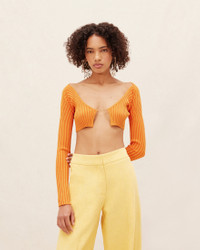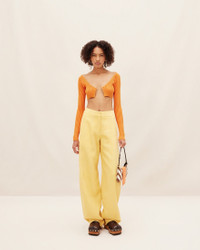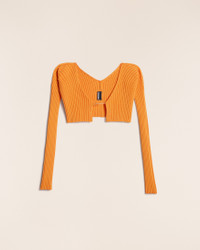 Le Raphia Micro charm logo cardigan - Micro length with long sleeves - Rib knit - Sewn gold metal charm logo 81% Viscose - 12% Polyamide/Nylon - 4% Elastane - 3% Polyester Made in Portugal Ref.213KN108-2190-710