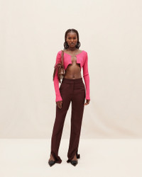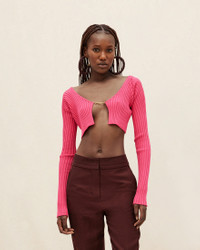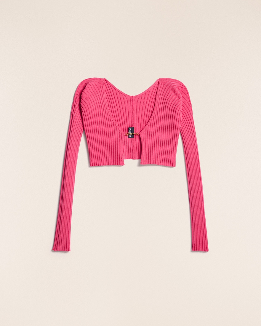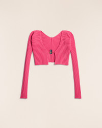 LE SPLASH Micro charm logo cardigan - Micro length with long sleeves - Rib knit - Sewn gold metal charm logo 81% Viscose - 12% Polyamide/Nylon - 4% Elastane - 3% Polyester Made in Portugal Ref.213KN108-2190-430