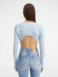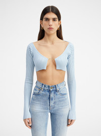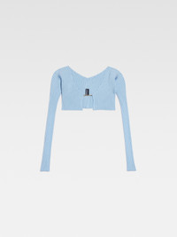 LE CHOUCHOU Micro charm logo cardigan - Micro length with long sleeves - Rib knit - Sewn gold metal charm logo The model is 177 cm and wears a size 34. 81% Viscose - 12% Polyamide - 4% Elastane - 3% Polyester Made in Portugal Ref.213KN108-2190-321