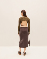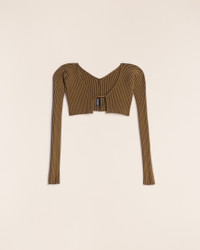 Le Raphia Micro charm logo cardigan - Micro length with long sleeves - Rib knit - Sewn gold metal charm logo 81% Viscose - 12% Polyamide/Nylon - 4% Elastane - 3% Polyester Made in Portugal Ref.213KN108-2190-850