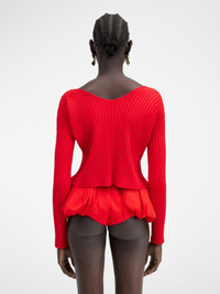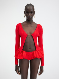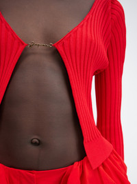 LE CHOUCHOU Seamless charm logo cardigan - Rib knit - Straight cut - Long fitted sleeves - Sewn gold metal charm logo The model is 180 cm and wears a size 34. 82% Viscose - 11% Polyamide - 4% Elastane - 3% Polyester Made in Italy Ref.223KN500-2190-470