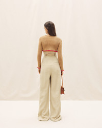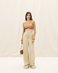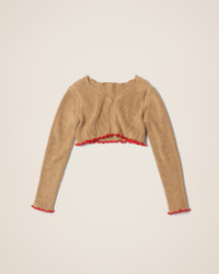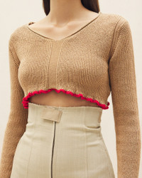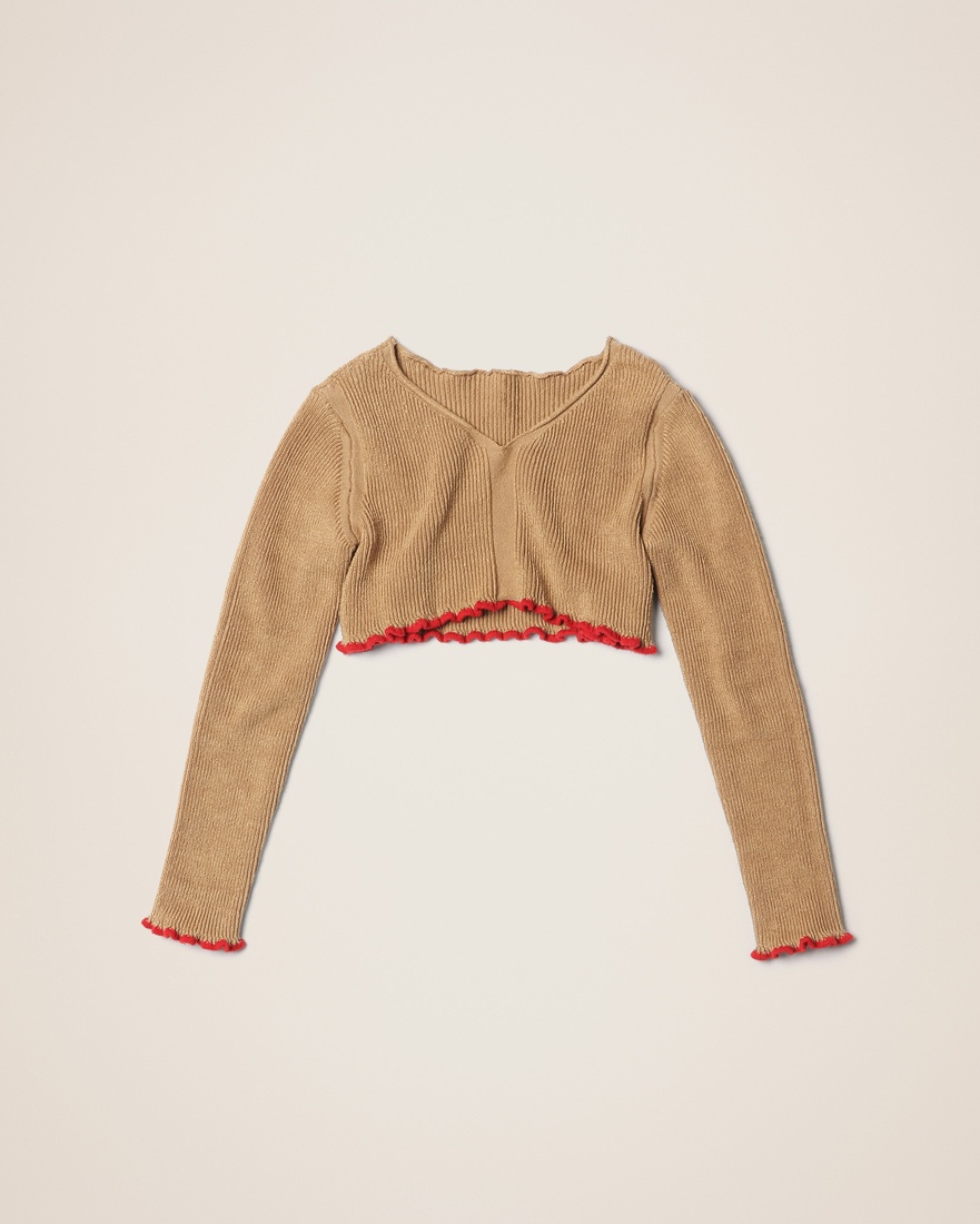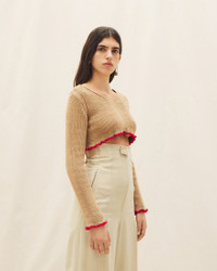 LE PAPIER Cropped ruffled sweater - Cropped fit with long sleeves - Ribbed knit - Wide V-neck - Contrast ruffled hem and sleeves 50% Linen - 35% Polyamide/Nylon - 15% Elastane Made in Italy Ref.223KN086-2123-810