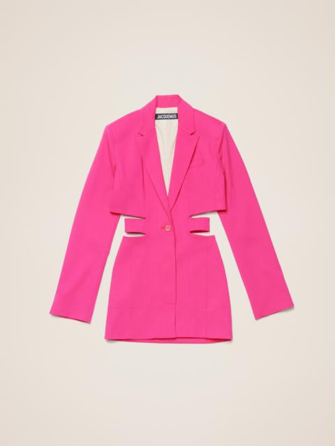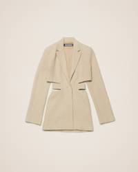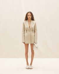 LE PAPIER Blazer mini dress - Tailored fit - Linen canvas - Notched lapel - Hidden buttoned closure with one visible button - Welt pocket on the chest - Cut-out waist with attached buttoned belt - Single buttoned sleeves - Side-seam pockets - Back welt pocket - Engraved buttons 100% Linen Made in Romania Ref.221DR016-1029-150