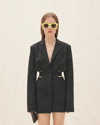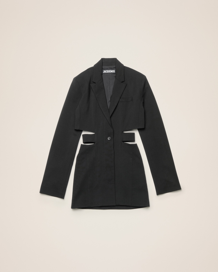 LE PAPIER Blazer mini dress - Tailored fit - Notched lapel - Hidden buttoned closure with one visible button - Welt pocket on the chest - Cut-out waist with attached buttoned belt - Single buttoned sleeves - Side-seam pockets - Engraved buttons - Back welt pocket 98% Virgin Wool - 2% Elastane Made in Romania Ref.221DR016-1075-990