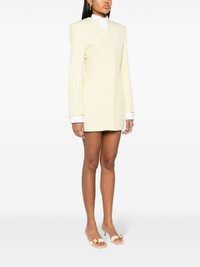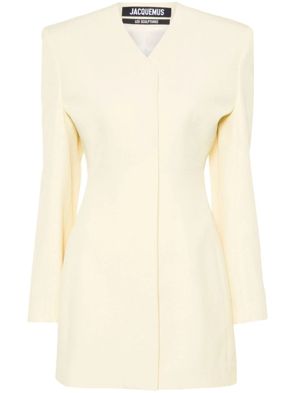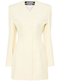 La Robe Cubo mini dress Jacquemus’ La Robe Cubo mini dress hails from the Les Sculptures collection inspired by French style icons like Catherine Deneuve and the works of Swiss artist Giacometti. It’s tailored from pale-yellow canvas to hold the shape of the wide, structured shoulders that enhance the look of the nipped waist. Highlights - Pale yellow - Canvas - Concealed front press-stud fastening - Collarless - V-neck - Shoulder pads - Long sleeves - Split cuffs - Thigh-length - Full satin lining Imported Composition Outer: Viscose 88%, Polyamide 12% Lining: Viscose 100% SIZE & FIT Model measurements Height 5 ft 11 in(1.8 m) Bust/Chest 30.7 in(78 cm) Hips 35.03 in(89 cm) Waist 24.4 in(62 cm) Measurement SLEEVE LENGTH 24.01 in(61 cm) HIPS 33.85 in(86 cm) LENGTH 32.28 in(82 cm) WAIST 25.98 in(66 cm) FittingInformation Designed for a slim fit that sits just away from the body offering a close yet comfortable fit The internal shoulder pads offer a structured shape Made from a midweight non-stretch fabric This piece fits true to size – take your usual size