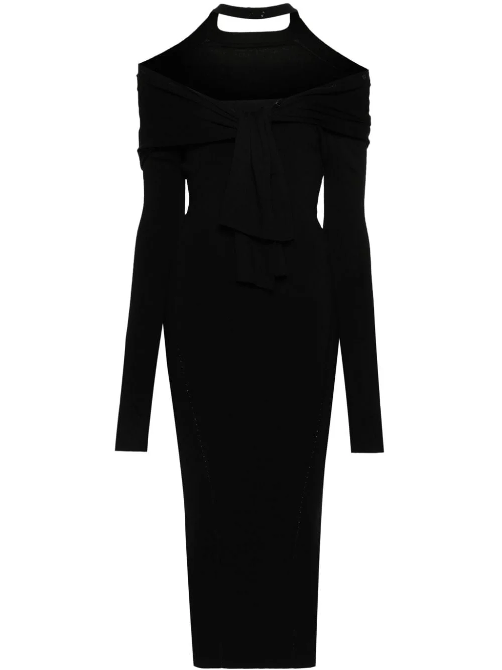 La Robe Doble midi dress Jacquemus' black La Robe Doble midi dress is inspired by the timeless style of French fashion icons like Catherine Deneuve and Isabelle Adjani. It’s named after the double neckline which has an adjustable buttoned strap and trompe l’oeil ties that recreate the look of wrapped cardigan sleeves. A layered back panel cocoons around the bare shoulders while split cuffs create drape. Highlights - Black - Virgin wool blend - Knitted construction - Buttoned neck strap - Bardot neckline - Long slit sleeves - Tie-fastening straps - Mid-calf length Imported Composition Virgin Wool 81%, Polyamide 18%, Elastane 1% SIZE & FIT Model measurements Height 5 ft 11 in(1.8 m) Bust/Chest 30.7 in(78 cm) Hips 35.03 in(89 cm) Waist 24.4 in(62 cm) Measurement SLEEVE LENGTH 25 in(63.5 cm) HIPS 27.99 in(71.1 cm) LENGTH 45 in(114.3 cm) WAIST 24.01 in(61 cm) BUST 27.99 in(71.1 cm) FittingInformation Designed for a close fit throughout Made with a midweight knit, this piece offers some stretch This piece fits true to size – take your usual size Washing instructions Hand Wash