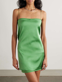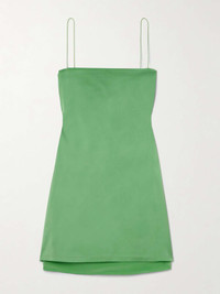 EDITORS'NOTES Jacquemus channels '90s minimalism to create this chic 'The Mia' mini dress. It's made from lustrous satin that's layered with crepe de chine at the hem and has slender, barely-there straps. SIZE & FIT Model measurements: - Fits true to size, however those who are between sizes should take the smaller size - Designed for a slim fit - Mid-weight, non-stretchy fabric - Model is 175cm/ 5'9" and is wearing a FR 34 - Bust: 81cm/ 32" - Waist: 64cm/ 25" - Hip: 89cm/ 35" DETAILS & CARE - Green satin and crepe de chine - Button fastenings at side - 96% viscose, 4% elastane; trim: 100% polyester - Dry clean