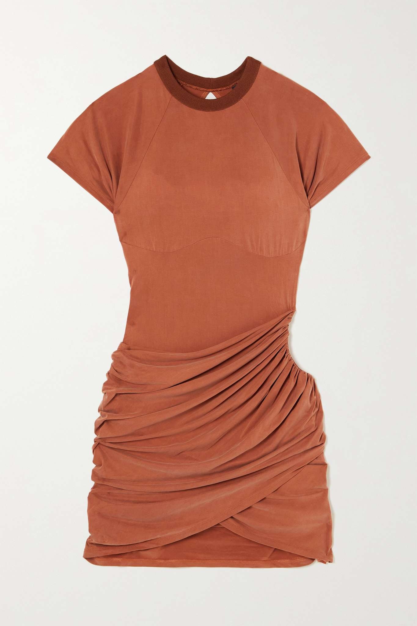EDITORS'NOTES Jacquemus loves to play with fabric - artful drapes, twists and knots feature throughout its collections. This 'Espelho' dress is made from stretch-jersey with a ruched, asymmetric skirt and a cutout circle at the waist. SIZE & FIT - Fits true to size, however those who are between sizes should take the smaller size - Designed for a very close fit - Particularly short in length - Lightweight, stretchy fabric - Model is 177cm/ 5'10" and is wearing a size XSmall DETAILS & CARE - Orange and burgundy stretch-jersey - Slips on - 93% cupro, 7% elastane - Dry clean