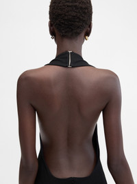 LA CROISIERE Flared halter dress - Fitted shape - Thick stretch jersey - Mid-calf length - High halter neckline - Flared from the hip - Metal buckled neckline on the back - Invisible back zipper The model is 179cm and wears a size 48 78% Polyamide - 22% Elastane / Lining: 78% Viscose - 16% Polyamide - 6% Elastane Made in Portugal Ref. 251DR183-1667-990