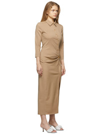 Three-quarter sleeve stretch virgin wool twill dress in beige. · Offset button closure at front · Front patch pocket at chest · Gathering at front with lanyard clasp fastening in gold-tone · Concealed two-button closure at front slit · Tonal locker loop at back · Unlined Part of the La Montagne collection. Supplier color: Beige 98% virgin wool, 2% elastane.