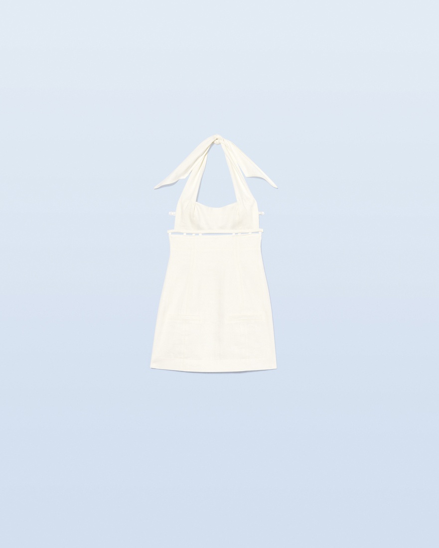 LE SPLASH Bikini mini dress - Fitted shape - Halter neckline that ties in the back - Elasticated bra straps - Welt pockets in the front - Invisible zipper The model is 176 cm and wears a size 34 52% Polyamide/Nylon - 48% Linen Made in Bulgaria Ref.221DR010-1007-110