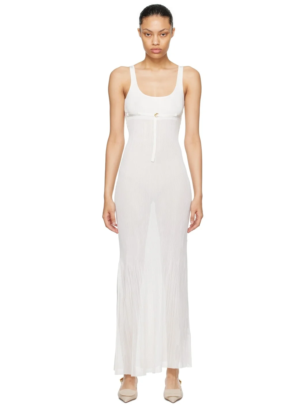 Semi-sheer rib knit recycled polyester-blend dress. · Scoop neck · Adjustable cinch strap at chest · Fixed shoulder straps · Unlined Part of the Le Chouchou collection. Supplier color: White 78% recycled polyester, 14% polyester, 8% polyamide. Made in Italy 232553F055003