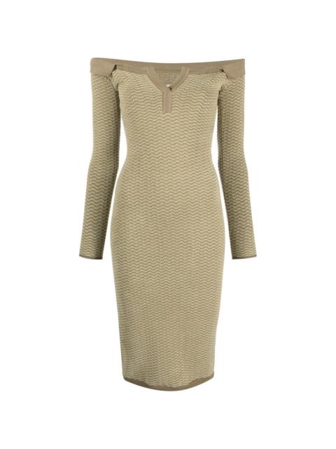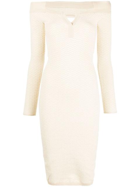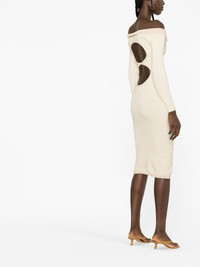 La robe maille Pampero dress The neckline steals focus on this midi dress from Jacquemus: it's designed to look like a stretched polo collar hugging the shoulders. A wavy jacquard patten and oval-shaped back cut-outs add further visual interest. Imported Composition Cotton 80%, Spandex/Elastane 20% SIZE & FIT Model measurements Height 5 ft 10 in(1.79 m) Bust/Chest 31.1 in(79 cm) Hips 35 in(89 cm) Waist 24 in(61 cm) FittingInformation This piece fits true to size. We recommend you get your regular size Cut for a close fit Made with a mid-weight stretch fabric