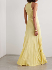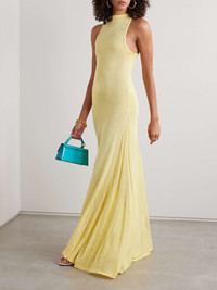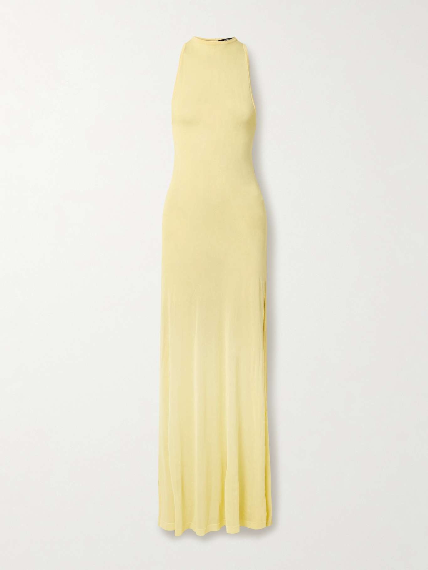 EDITORS'NOTES Jacquemus' knitted gown is designed in a sunny shade that's perfect for outdoor events. It has a halter neckline and slinks through the body before fanning out at the hem. Style yours with hoops and one of the label's box bags. SIZE & FIT Model measurements: - Fits true to size, take your normal size - Designed for a close fit - Fine knit - Model is 175cm/ 5'9" and is wearing a FR 36 - Bust: 81cm/ 32" - Waist: 65cm/ 26" - Hip: 90cm/ 35" DETAILS & CARE - Pale-yellow viscose - Button-fastening keyhole at back - 100% viscose