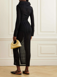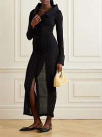 EDITORS'NOTES Jacquemus’ ‘La Robe Manta’ is made from ribbed-knit that's lightweight and semi-sheer, so you'll want to underpin it with coordinating lingerie or a bodysuit for coverage. It has a sizable notched collar and gently structured cuffs. Don't miss the grosgrain 'J' at the nape. SIZE & FIT Model measurements: - Fits true to size, take your normal size - Designed for a slim fit - Lightweight knit - Model is 177cm/ 5'10" and is wearing a FR 36 - Bust: 82cm/ 32.3" - Waist: 66cm/ 26" - Hip: 90cm/ 35.4" DETAILS & CARE - Black ribbed-knit - Button fastenings through front - 80% viscose, 20% polyamide - Hand wash