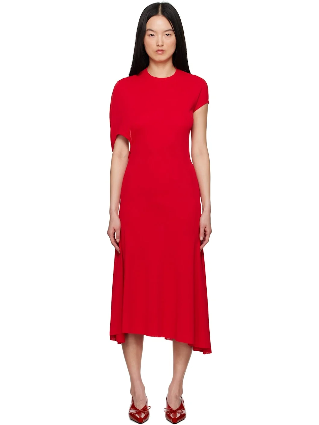 Viscose- and nylon-blend jersey cape-style midi dress. · Asymmetric construction · Crewneck · Raw edge at hem · Draping at open back Part of the La Croisiere collection. Supplier color: Red 82% viscose, 18% polyamide. Made in Portugal 251553F054013