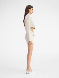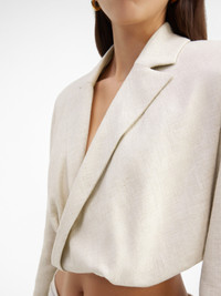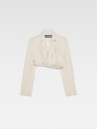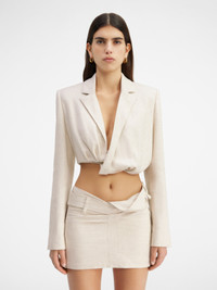 LE CHOUCHOU Twisted cropped blazer - Cropped, structured fit - Long notched lapel - Twisted and draped hemline - Buttoned sleeves The model is 177 cm and wears a size 34. 70% Viscose - 30% Linen / Lining : 49% Cotton - 46% Acetate - 5% Elastane Made in France Ref.233JA039-1358-130
