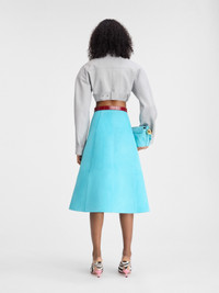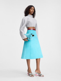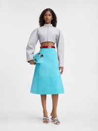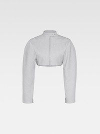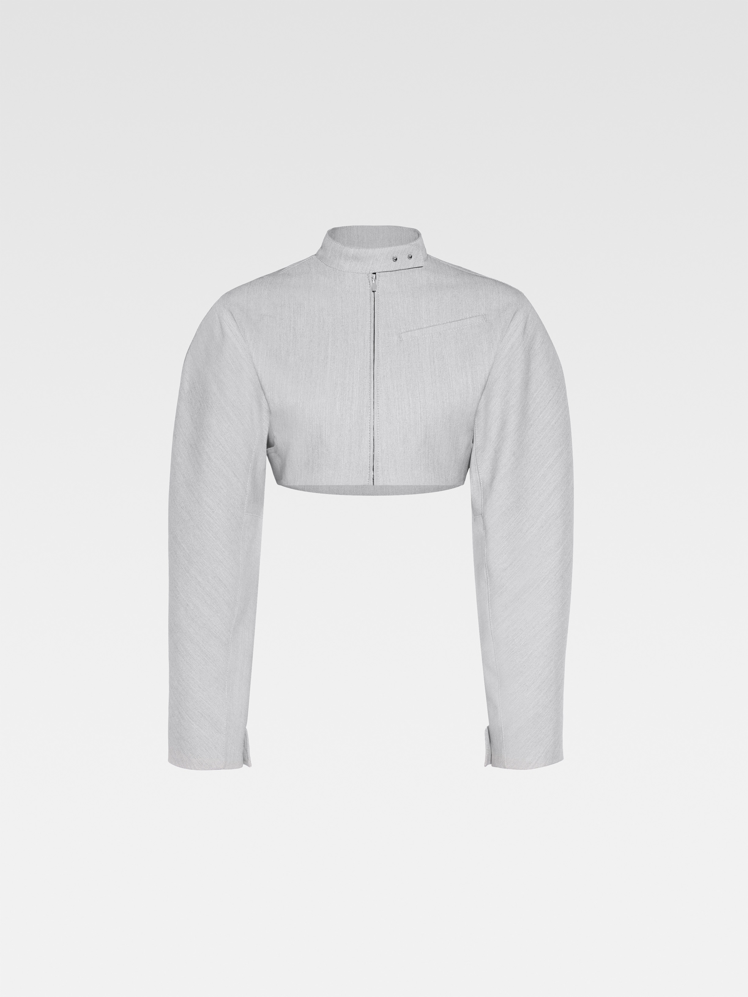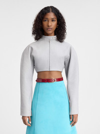 LA CASA Cropped moto jacket - Cropped, round fit - Stand collar with ajustable stud fasteners - Zip closure - Rounded sleeves - Chest welt pocket - Back yoke - Adjustable belt on the back with metal buckle - Zippers and adjustable sleeve cuffs on the back - Silver metal hardware - Fully lined The model is 175cm and wears a size 34 35% Polyester - 34% Cotton - 29% Virgin wool - 2% Elastane Made in Bulgaria Ref. 243JA065-1660-910