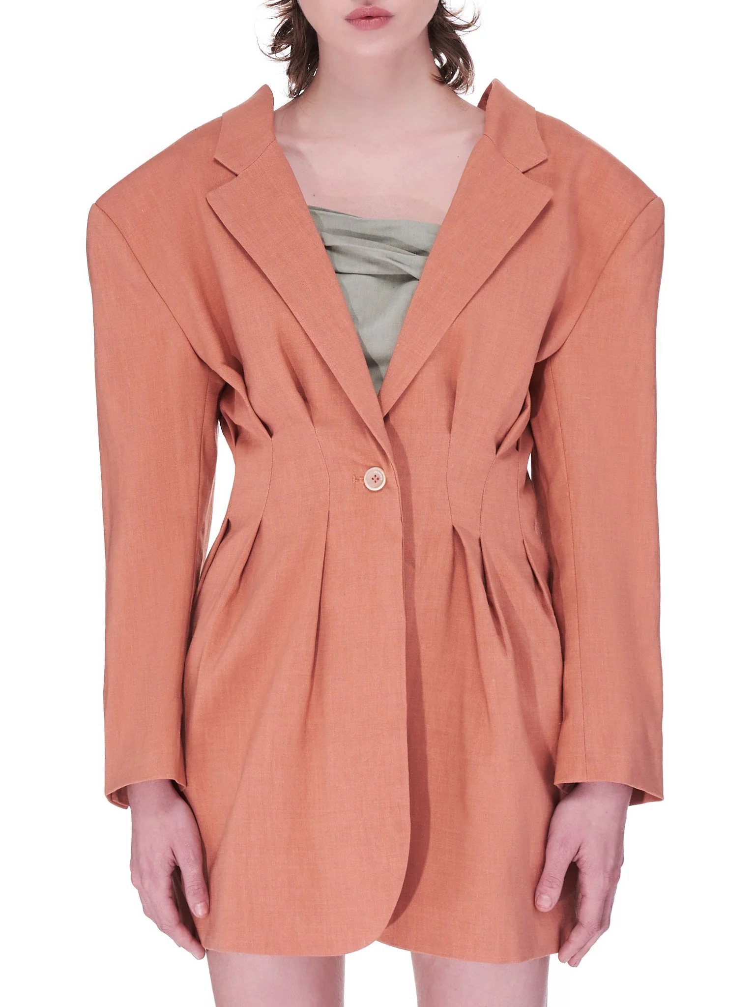 Jacquemus blazer in terracotta, notched lapels, front button closure, single breasted design, fitted waist, marked front pleats, open back with strap detailing, all over pinstriping, long sleeves, cuffs with button closure, straight/finished hem, tonal stitching. Made in Romania. French Sizing. Composition - (Main) 52% Hemp, 36% Virgin Wool, 12% Polyamide (Lining) 51% Viscose, 49% Cotton Model Measurements: Model is 5ft 8” and wearing a size 34. Bust: 32” Waist: 24” Hip: 34"