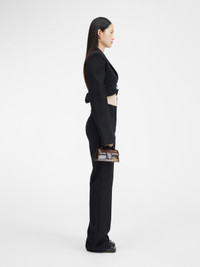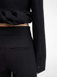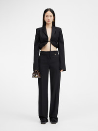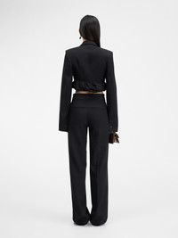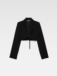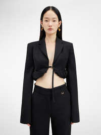 LE CHOUCHOU Rolled bolero blazer - Cropped, structured fit - Notched lapel - Welt pocket on the chest - Adjustable metal D-ring fastener - Twisted and rolled hem - Extended buttoned cuffs The model is 175 cm and wears a size 35. 100% Virgin wool / Lining : 49% Cotton - 46% Acetate - 5% Elastane Made in France Ref.233JA035-1333-990