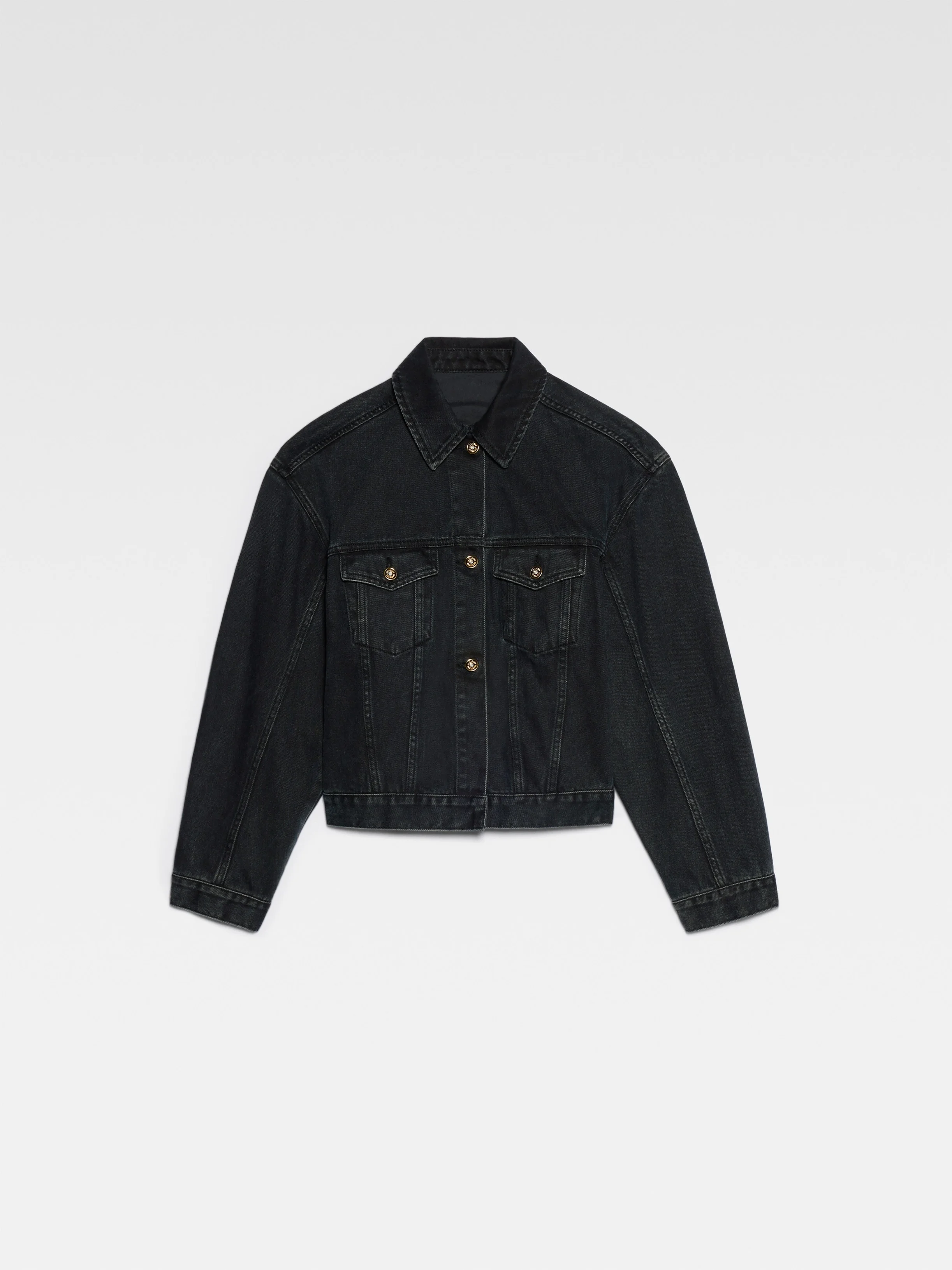 Les Classiques Round denim jacket - Fitted shape - Over-dyed black denim - Pointed collar - Rounded shoulders - Engraved metal buttons - Denim patch pockets - Horizontal seam on the sleeves - Back yoke - Integrated buttoned belt in the back - Large denim patch The model is 178 cm and wears a size 34 100% Cotone Made in Portugal Ref. 241DE036-1515-990
