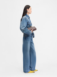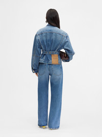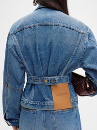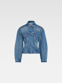 Les Classiques Curved denim jacket - Fitted shape - Washed indigo denim - Pointed collar - Rounded shoulders - Engraved metal buttons - Denim patch pockets - Horizontal seam on the sleeves - Back yoke - Integrated buttoned belt in the back - Large denim patch - Contrast stitching The model is 171 cm and wears a size 34 100% Cotone Made in Portugal Ref. 241DE036-1513-33C