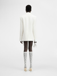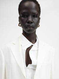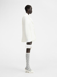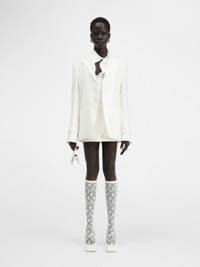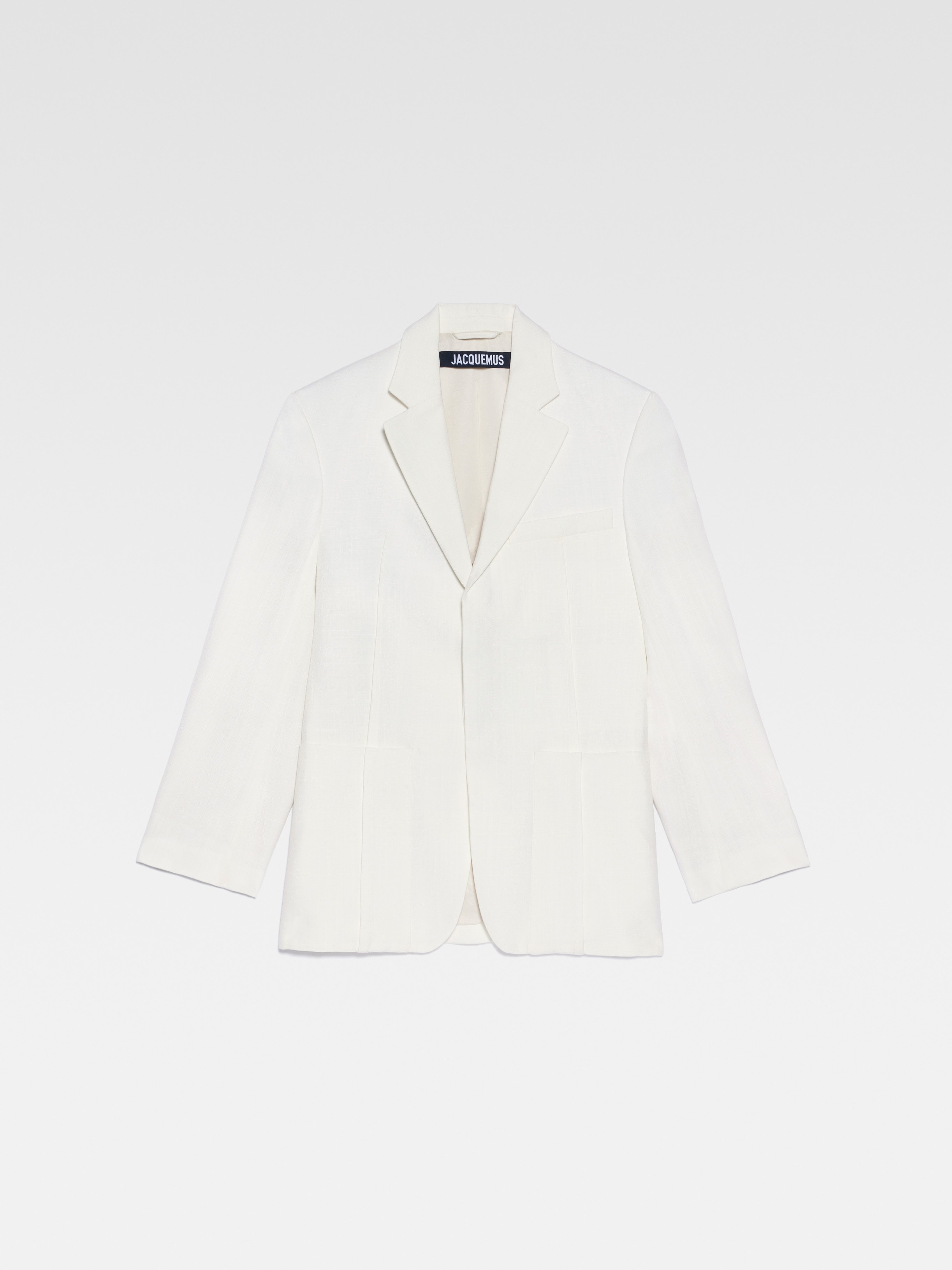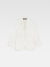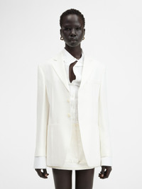LE CHOUCHOU Square jacket - Boxy fit inspired by the men's wardrobe - Stretch wool-viscose - Notched lapel - Chest welt pocket and large patch pockets - Hidden button placket - Inverted darts down the front - Interior welt pocket The model is 180 cm and wears a size 40. 100% Viscose / Lining : 49% Cotton - 46% Acetate Made in Romania Ref.213JA101-1359-100