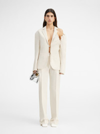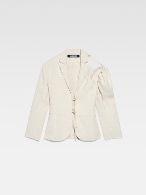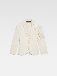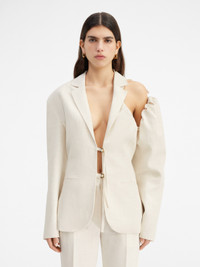 LE CHOUCHOU Asymmetric sleeve blazer - Fitted shape - Notched lapel - One exposed shoulder with a puffed sleeve and adjustable attached strap - One boxy shoulder with a classic sleeve - Adjustable metal D-ring fasteners - Welt pockets The model is 177 cm and wears a size 34. 60% Linen - 26% Viscose - 14% Polyester / Lining : 49% Cotton - 46% Acetate - 5% Elastane Made in France Ref.233JA040-1069-110