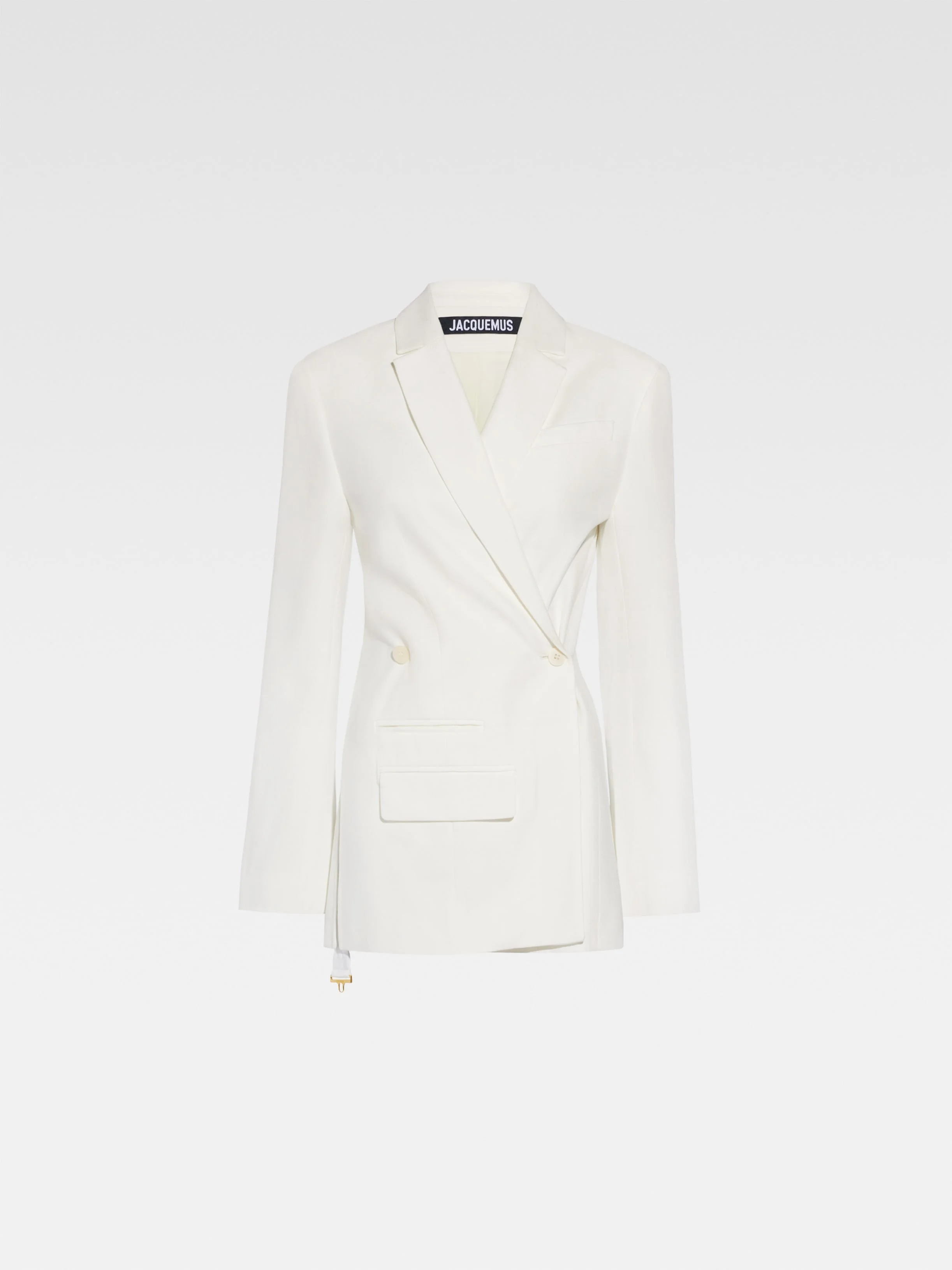 Les Classiques Crossover double breasted blazer - Fitted jacket with structured shoulders - Mottled linen - Double-breasted closure and exaggerated crossover - Cinched and draped waist - Chest welt pocket - Small double welt pocket - Flap pocket - Ribbon insert and silver metal pull detail - Sleeve slits and buttonholes with contrast stitch detail The model is 180 cm and wears a size 36 100% Viscose - 65% Polyester - 35% Cotton / Lining: 48% Acetate - 46% Cotton - 6% Elastane Made in Romania Ref. 231JA022-1359-100