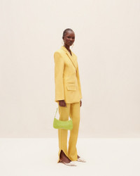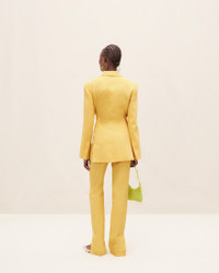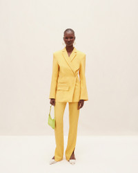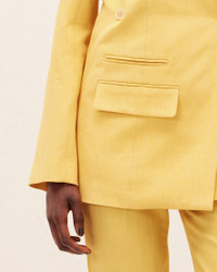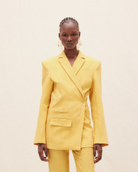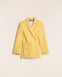Le Raphia Crossover double breasted blazer - Fitted jacket with structured shoulders - Mottled linen - Double-breasted closure and exaggerated crossover - Cinched and draped waist - Chest welt pocket - Small double welt pocket - Flap pocket - Ribbon insert and silver metal pull detail - Sleeve slits and buttonholes with contrast stitch detail 60% Linen - 26% Viscose - 14% Polyester Made in Romania Ref.231JA022-1069-250