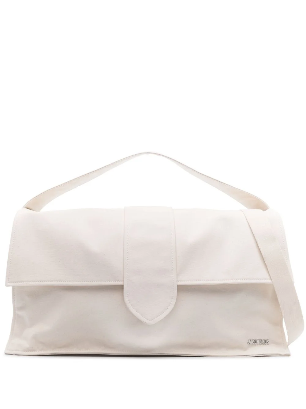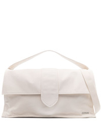 Le Bambino de Voyage holdall bag Jacquemus' Le Chouchou collection sees the brand take signature silhouettes to the next level with voluminous constructions. The iconic Le Bambino is seen here reimagined as a holdall weekender bag, crafted from soft cotton with a roomy main compartment. Highlights - Off-white - Cotton - Silver-tone hardware - Logo plaque - Adjustable detachable shoulder strap - Single flat top handle - Foldover top with magnetic fastening - Main compartment - Internal zip-fastening pocket - Slip pocket to the rear Made in Italy Composition Outer: Cotton 100%, Calf Leather 100% Lining: Cotton 100% SIZE & FIT Measurement DEPTH 7.87 in(20 cm) HANDLE 5.9 in(15 cm) HEIGHT 12.99 in(33 cm) STRAP 17.71 in(45 cm) WIDTH 23.62 in(60 cm)