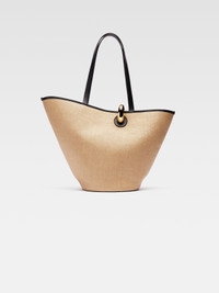 LA CASA Asymmetric bucket bag - Faux-raffia bucket bag with leather trim - Ring clasp in gold-plated metal - Shoulder top-handle - Interior zipped pocket - Topstitched details - Gold-plated logo and hardware - Fully lined in cotton - Dyed edges - Height: 60cm - Length: 35cm - Width: 23cm 100% Polyamide / Lining: 100% Cotton Made in Italy Ref. 243BA382-3215-1FY