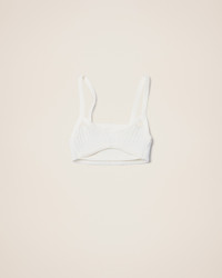 LE PAPIER Strappy knit bra - Technical shape - Fuzzy knit - Contrast elasticated straps - Cut-out details 31% Polyamide/Nylon - 30% Polyester - 30% Virgin Wool - 9% Viscose Made in Portugal Ref.223KN034-2145-100