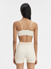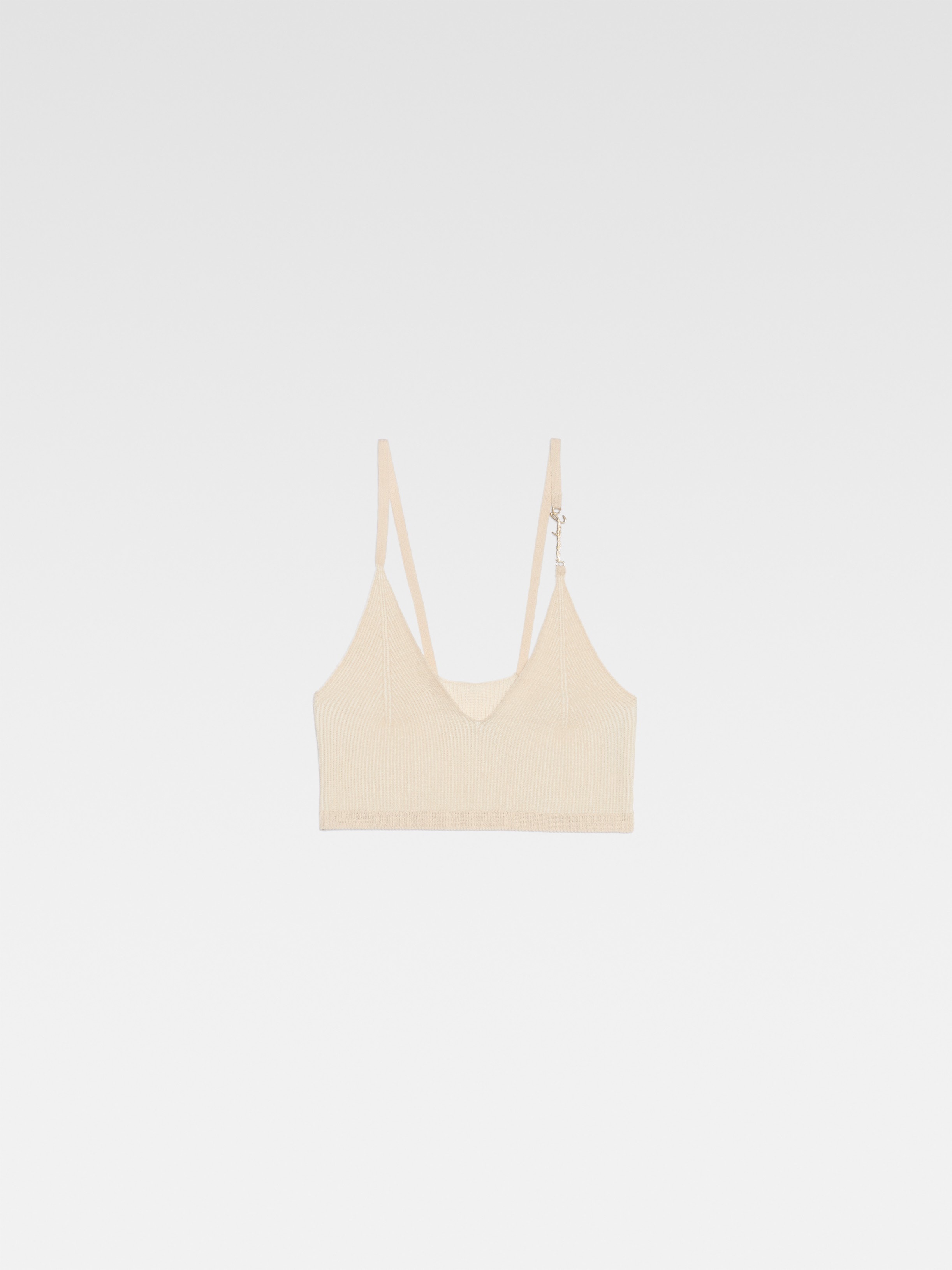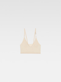 Les Classiques Knit bra - Fitted shape - Two tone rib knit - Flat straps - Gold metal charm logo on left shoulder strap - V-neckline The model is 171 cm and wears a size XS 80% Viscose - 10% Polyamide - 10% Polyester Made in Portugal Ref. 231KN502-2060-130