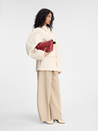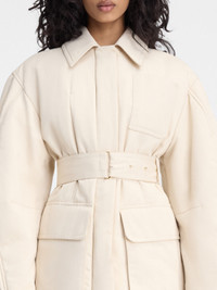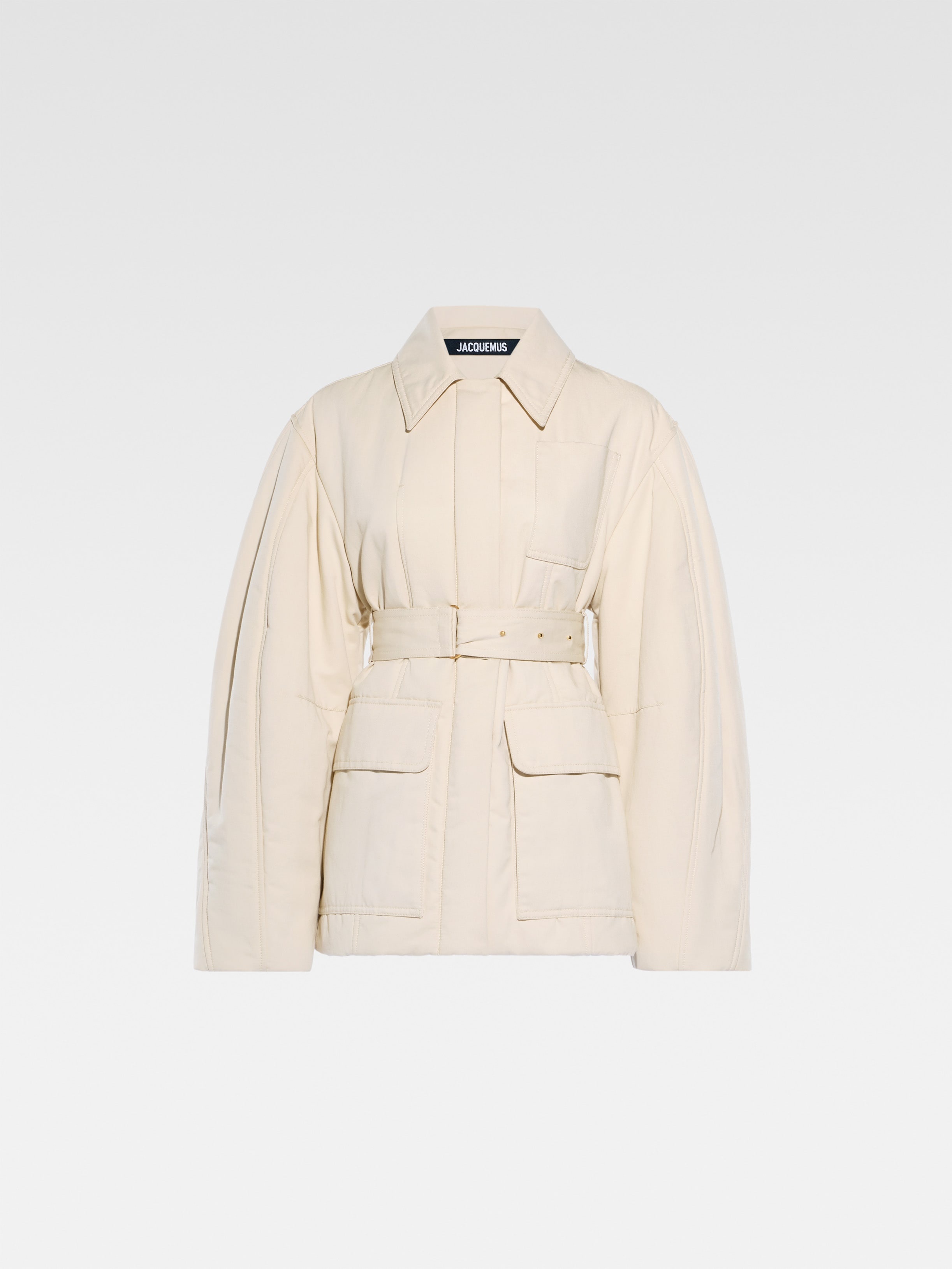 LA CASA Raglan-sleeve jacket - Hip-length - Round fit with fitted waist - Water-repellent textured cotton-linen - Wadded interior - Pointed collar - Topstitched details - Round raglan sleeves - Hidden snap-button placket - “J” shaped patch pocket - Removable belt with metal buckle - Belt loops - Oversized flap-pockets - Back yoke with “J” locker loop - Back slit - Gold metal hardware - Fully lined The model is 178cm and wears a size 34 82% Cotton - 18% Linen Made in Bulgaria Ref. 243CO067-1534-150