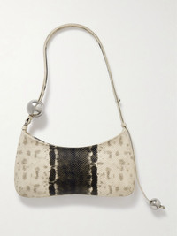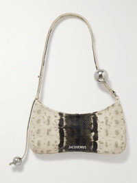 Meaning 'pearl kiss' in French, Jacquemus' 'Le Bisou Perle' shoulder bag has polished silver-tone beads strung on the leather strap. It's made from snake-effect leather in a curved shape and finished with a signature logo plaque. It's just the right size for your phone, keys and lip balm. Details & Care - Tonal-black and ivory snake-effect leather - Adjustable strap - Internal slip pocket - Twill lining - Zip fastening along top - Comes with dust bag - Weighs approximately 0.9lbs/ 0.4kg