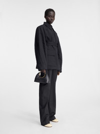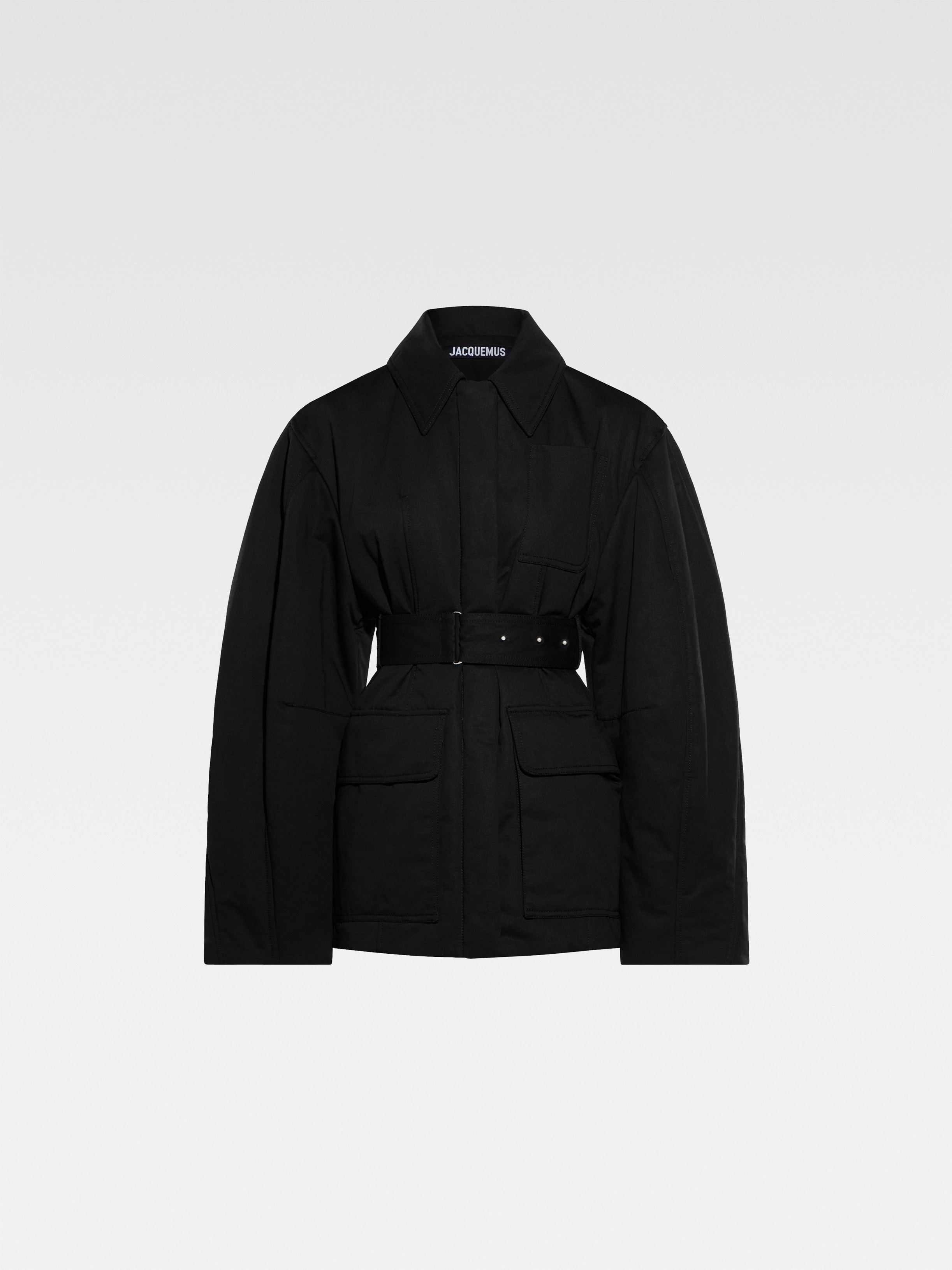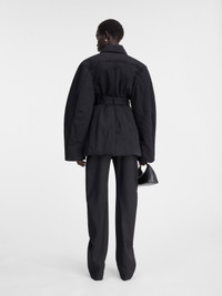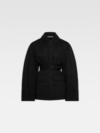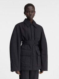 LA CASA Raglan-sleeve jacket - Hip-length - Round fit with fitted waist - Water-repellent textured cotton-linen - Wadded interior - Pointed collar - Topstitched details - Round raglan sleeves - Hidden snap-button placket - “J” shaped patch pocket - Removable belt with metal buckle - Belt loops - Oversized flap-pockets - Back yoke with “J” locker loop - Back slit - Gold metal hardware - Fully lined The model is 177cm and wears a size 34 82% Cotton - 18% Linen Made in Bulgaria Ref. 243CO067-1534-990