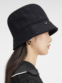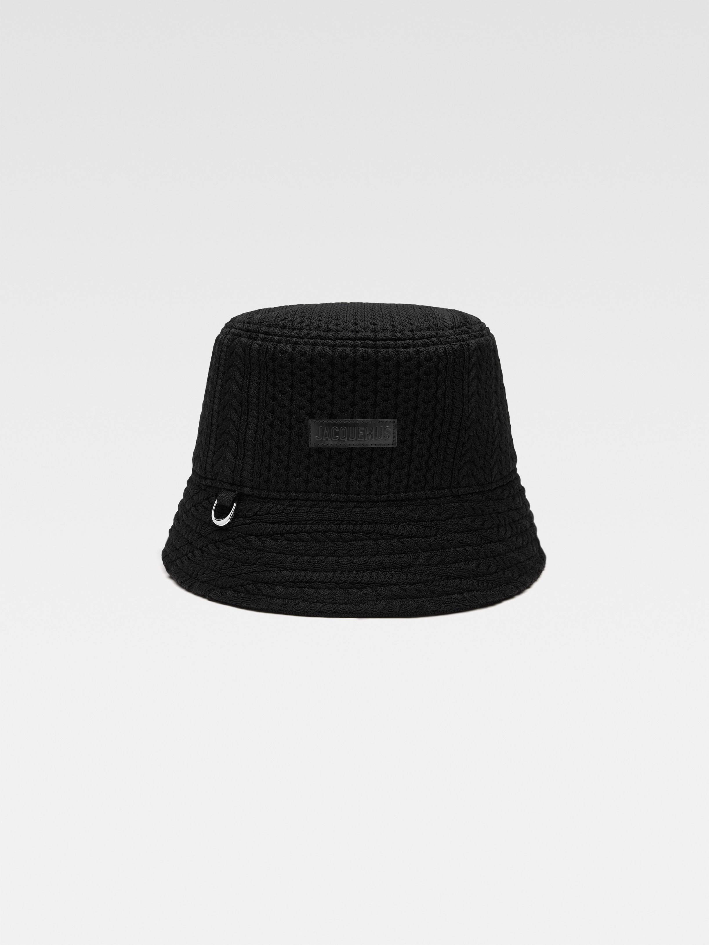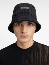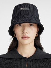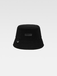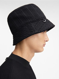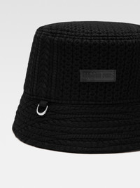 LES SCULPTURES Cable knit bucket hat. - Viscose and knit bucket hat - Cable knit - D-Ring - Leather logo patch - Lined in cotton - Topstitched brim 80% Viscose - 20% Nylon Made in Italy Ref.245AC648-2379-990