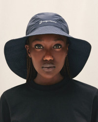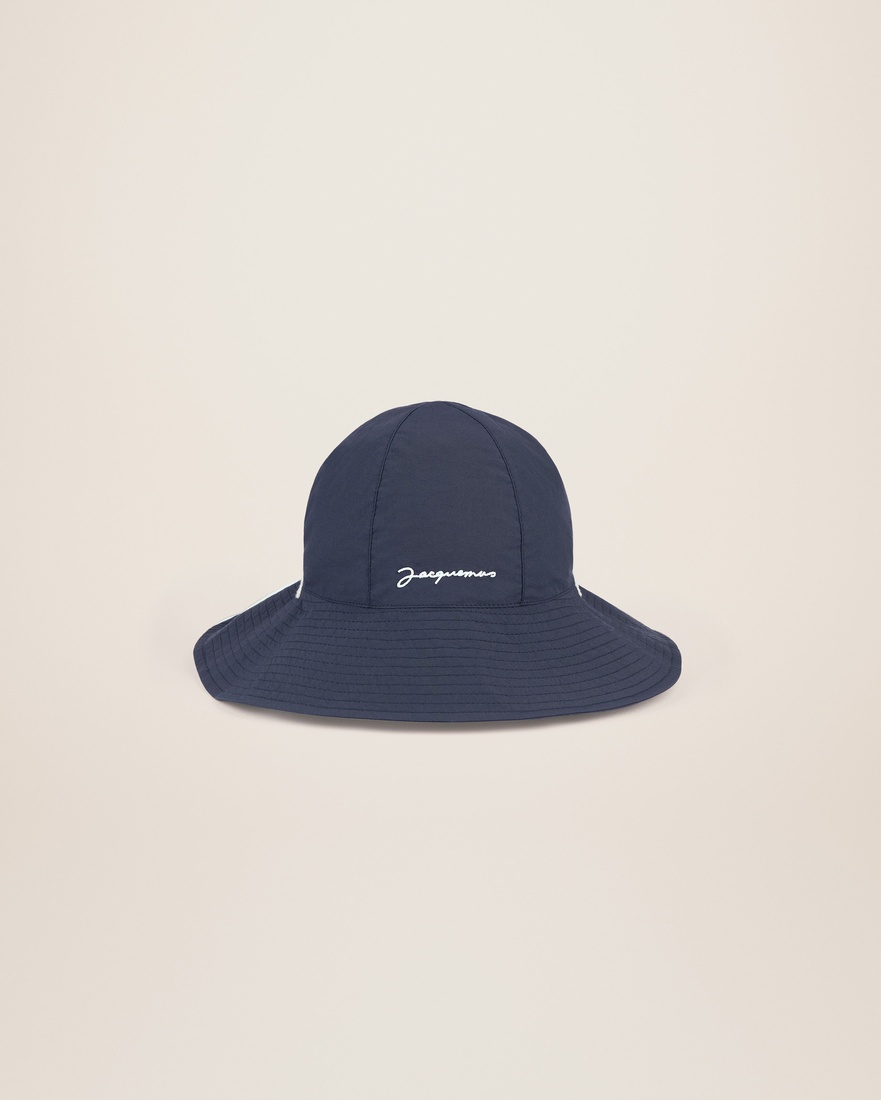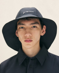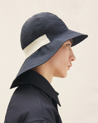 LE PAPIER Elasticated rain hat - Water-proof rain hat - Embroidered logo - Wide topstitched brim that is longer in the back - Exterior elastic in the back - Front length 8 cm - Back length 14 cm 74% Polyamide/Nylon - 26% Cotton Made in Bulgaria Ref.226AC405-1014-380