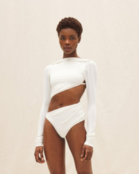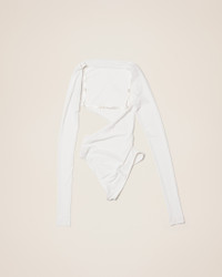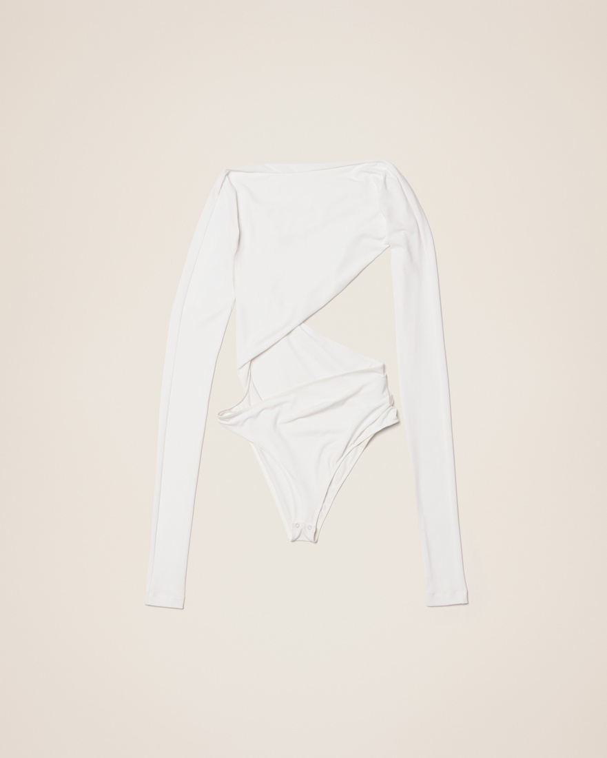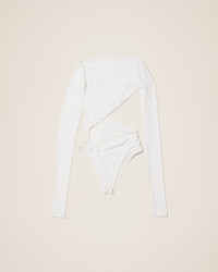 LE PAPIER Twisted bodysuit - Fitted shape - Cotton jersey - Draped boat neckline - Slanted cut out - Adjustable lingerie strap in the back - Low-cut thong - Snap button crotch flap 93% Polyester - 7% Elastane Made in Portugal Ref.223TO026-1063-100