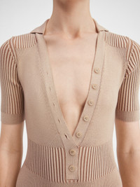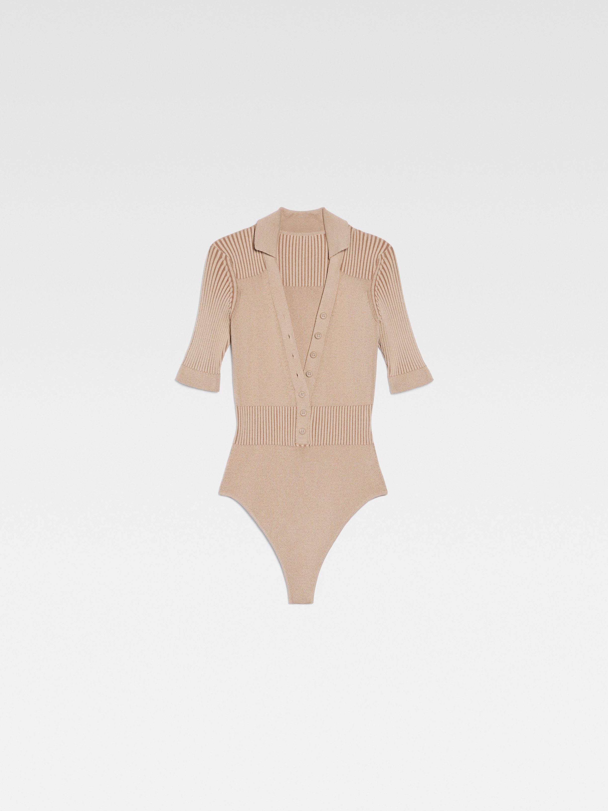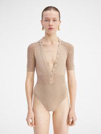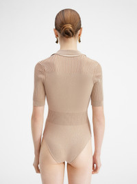 LE CHOUCHOU Polo bodysuit - Fitted shape with short sleeves - Two-tone plated knit - Polo neckline - Semi-buttoned plunging neckline with mother-of-pearl buttons - Snap button crotch opening The model is 175 cm and wears a size 34. 85% Viscose - 15% Polyester Made in Portugal Ref.211KN109-2040-180