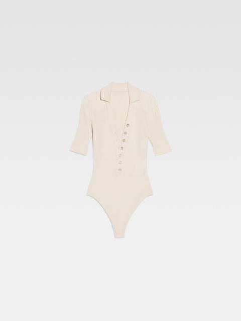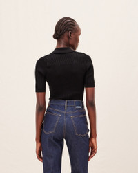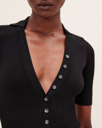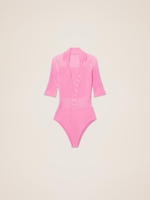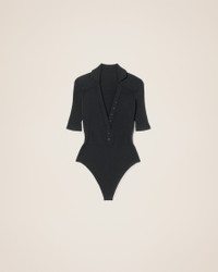 LE SPLASH Polo bodysuit - Fitted shape with short sleeves - Two-tone plated knit - Polo collar - Semi-buttoned plunging neckline with mother-of-pearl buttons - Snap button crotch opening The model is 175 cm and wears a size 34 85% Viscose - 15% Polyester Made in Portugal Ref.211KN109-2040-990