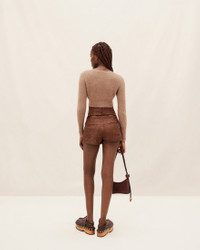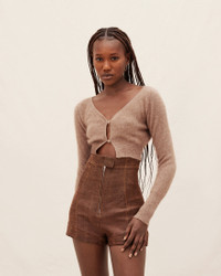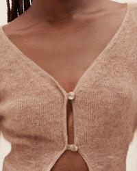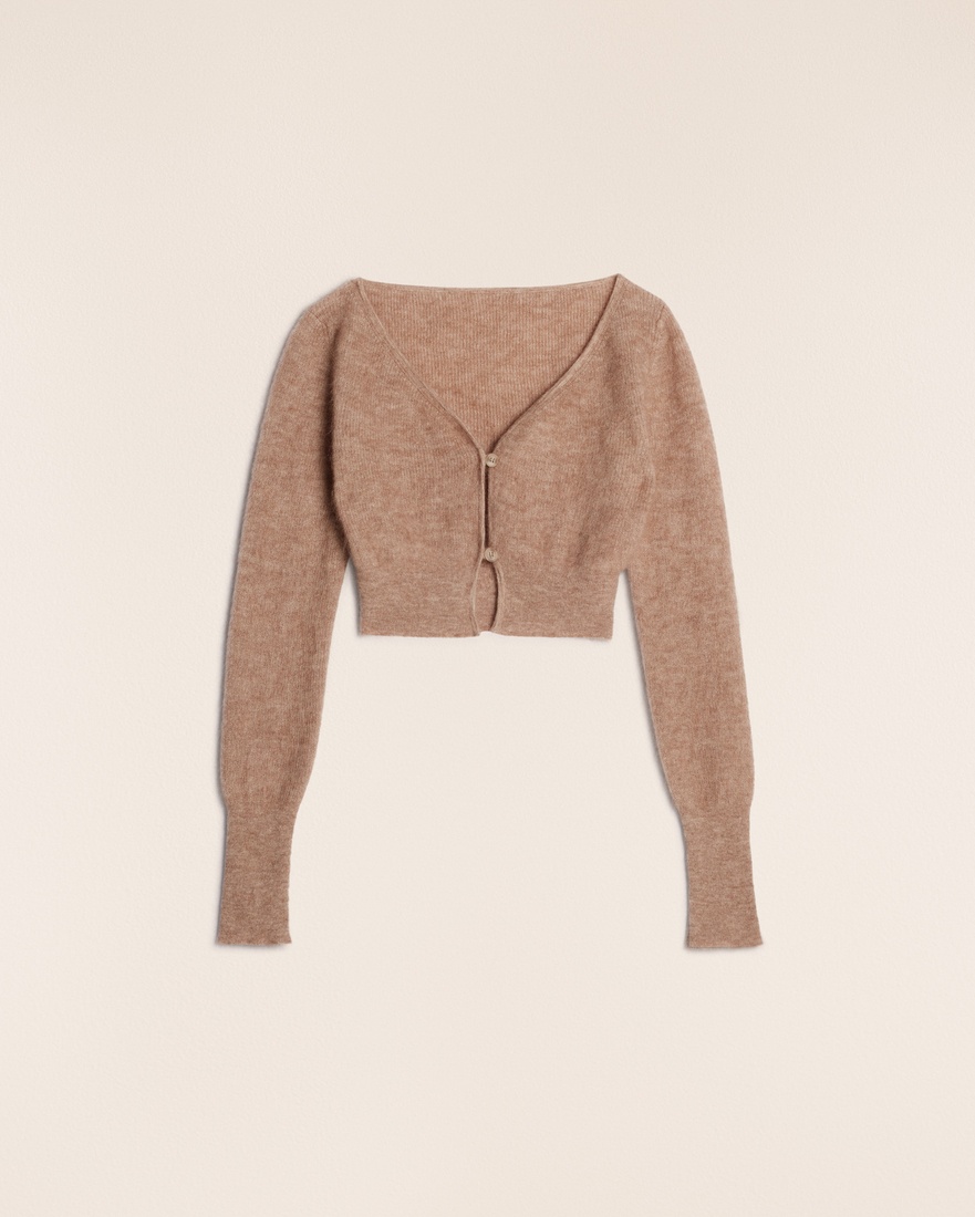 LE PAPIER Cropped mohair cardigan - Fitted shape with long sleeves - Fluffy mohair knit - Plunging neckline - Two button mother-of-pearl button closure - Ribbed collar, cuffs and hem The model is 173 cm and wears a size 34. 50% Mohair - 36% Polyamide/Nylon - 14% Merino Wool Made in Italy Ref.213KN203-2360-810