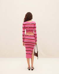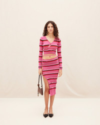Le Raphia Asymmetric cropped cardigan - Asymmetric fit - Constrast striped knit - V-neckline - Open slits with decorative buttons 44% Polyamide - 30% Cotton - 19% Recycled polyamide - 7% Elastane Made in Portugal Ref.231KN128-2282-450